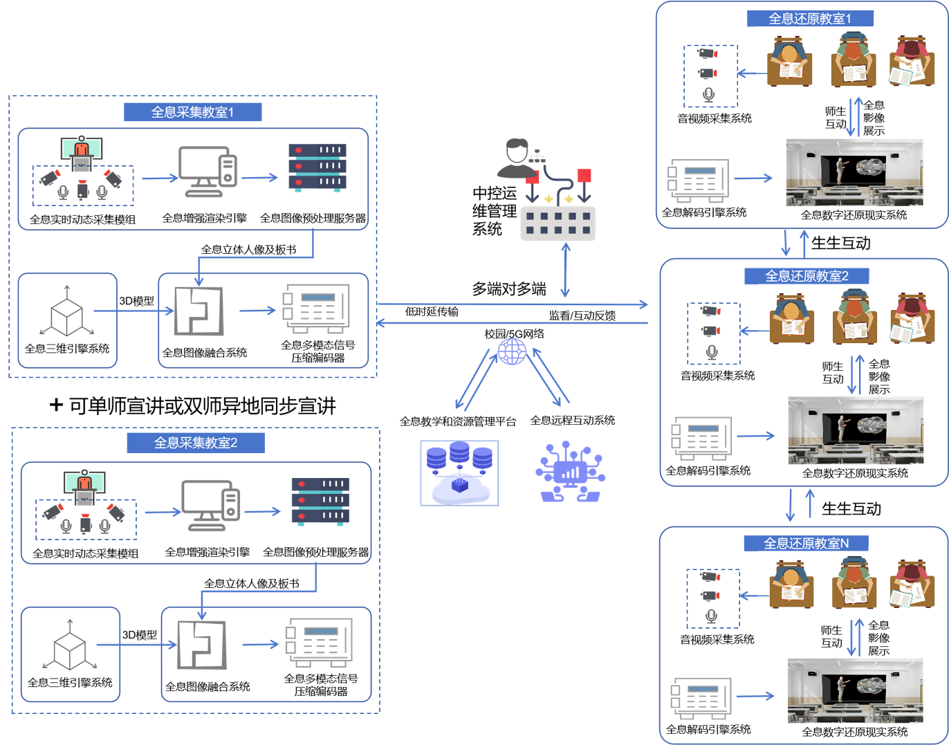 全息教室是本地化裸眼3D教学的基础配置。它以全息还原显示技术、智能交互控制与三维引擎技术为核心,构建出一个沉浸式、可交互的立体教学空间。在该方案中,复杂的抽象知识可转化为悬浮于空中的高保真三维模型,师生无需佩戴任何辅助设备,即可直接观察、旋转、缩放和剖切模型,让教与学突破传统二维屏幕的限制,进入三维可视化教学的新维度。 全息还原教室集成高性能三维引擎,支持海量3D教学资源的流畅展示与轻量化编辑,同时采用类自然景深光学设计,确保长时间观看不眩晕、不伤眼。它是一套集显示、交互、内容管理于一体的智慧教学基础设施。